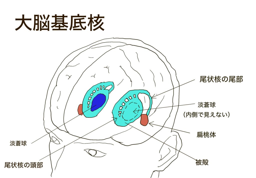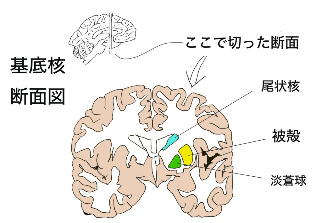 尾状核、被殻、淡蒼球という3つの部位で構成されます。前の二つをまとめて線条体(肉眼で線が見えるからだそうです)、後の二つをまとめてレンズ核(レンズみたいな形だからだそうです)とも呼びます。ややこしいですね。そして線条体の前方(腹側)に上記の側坐核があります。