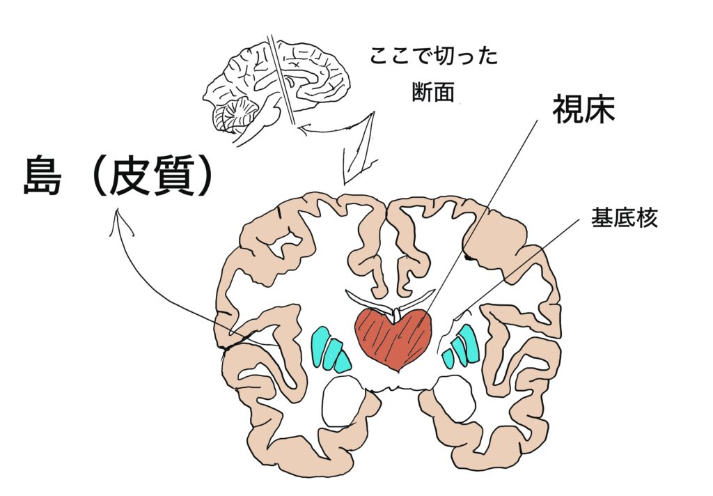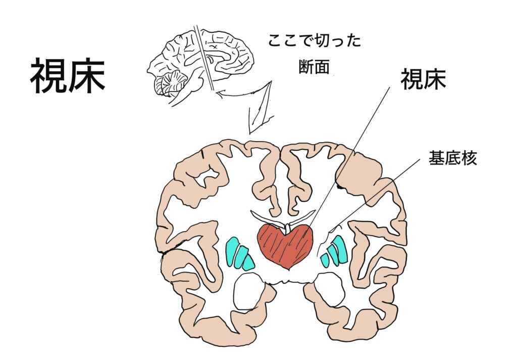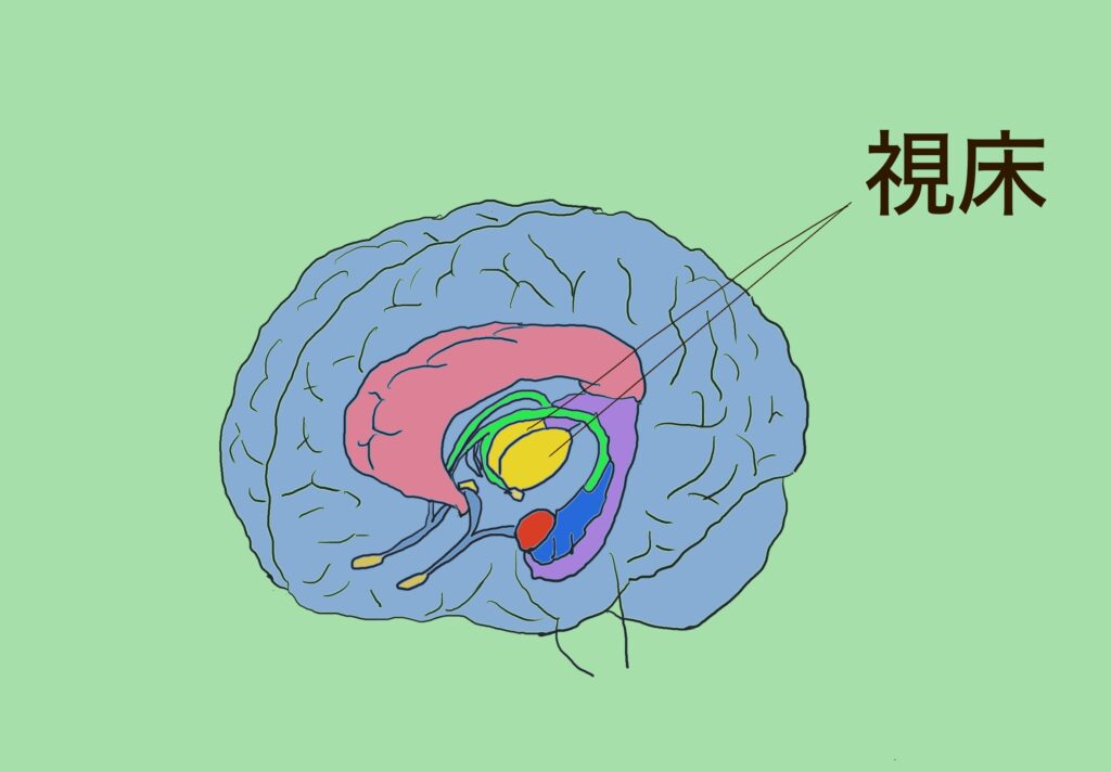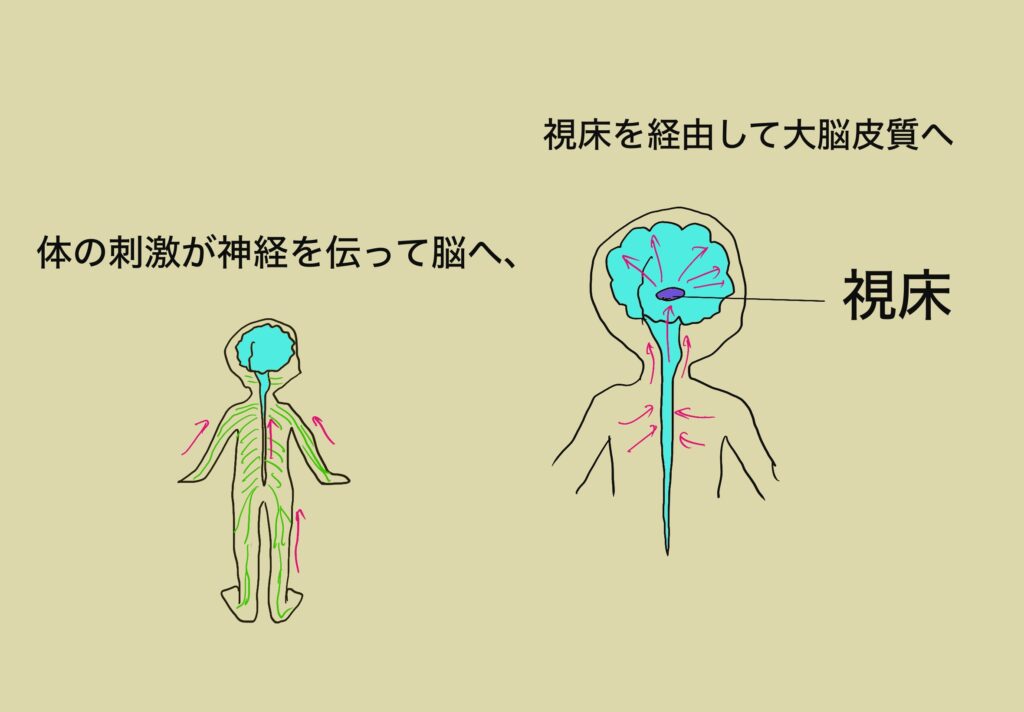 視床と視床下部は名前も似ていて隣に位置しているけど機能は全く異なるので注意が必要です。視床は、全身の感覚神経からの入力(手の先が痛いとか、足の先が冷たいとか)が脊髄を通って登ってきます。それが視床に入力し、ここでリレーして大脳皮質の感覚野に入力されます。大脳皮質で「痛い」と感じるわけです。嗅覚以外の全ての感覚が視床で中継されます。おそらく中継されながら、フィルターがかかっているのでしょう。