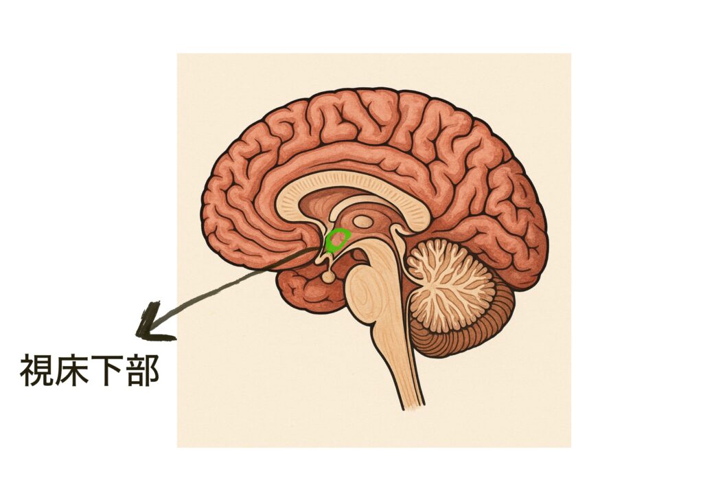 脳の底に位置する小さな部位ですが、生命維持の中枢を担っています。自律神経系に働きかけ、体の状態を一定に保つ「ホメオスタシス」の役割を担っています。摂食中枢、満腹中枢、血圧、心拍、飲水、体温、睡眠、ホルモンの調節などに関わっています。