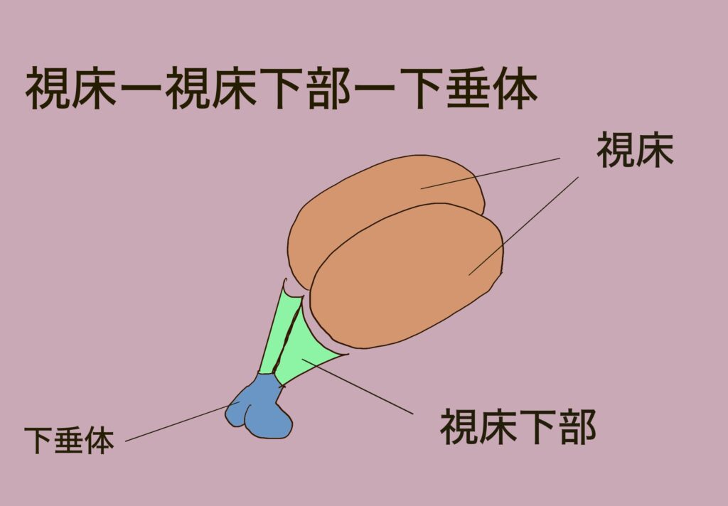下垂体は、脳の底ぶら下がった位置にあり、視床下部と短い茎でつながっています。鼻の奥の方の上側にあります。だから下垂体腫瘍などの治療では、鼻から機械を入れて、下垂体の一部を切除したりします。機能的にはホルモン活動の司令塔です。視床下部の指示で、ホルモンを作って放出しています。ホルモンを作る臓器に向かって、「ホルモンを作りなさい」と指示するホルモンです。甲状腺ホルモン(代謝をアップさせる)、副腎皮質ホルモン(いわゆるステロイドですね。ストレスや緊急事態に出るホルモンです)、性ホルモン(男性ホルモン、女性ホルモン)を作れと指示するホルモンです。脳の働きが、ホルモンを通じて全身に影響を与えていくことになります。心身相関を司る部分となります。